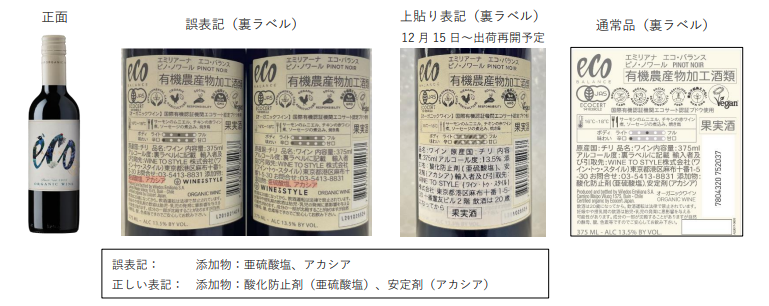 この度、弊社で輸入販売しております「エコ・バランス オーガニック・ピノ・ノワール ヴァ レ・デル・ビオビオ (375ml)」において、食品添加物の表示に一部誤り(用途名の欠落)があることが判明いたしました。商品の品質には問題ございませんが、弊社在庫に関しては正しい表記のバックラベルを上張りしたうえで出荷、販売いたします。出荷済みの商品に関して、上貼り用のバックラベルをご希望の方は、弊社担当までお問合せください。
