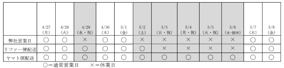 ゴールデンウィーク期間の営業日程についてのご連絡